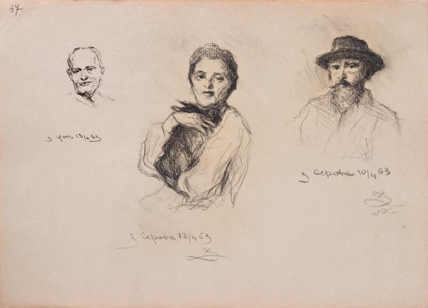 The sheet features three separate portrait images created using different graphic techniques. They are not linked by a single compositional concept and probably represent Yulian Zaiats' educational or research sketches based on various sources. On the left is a shoulder-length portrait of an elderly man facing forward, done in ink. The laconic linear manner forms a distinct silhouette, clearly outlining the facial features. The interpretation strives for a generalised image, without extensive modelling of texture and details. In the centre of the sheet is a drawing based on the well-known work by Valentyn Sierov – a portrait of Kleopatra Obninska, "Woman with a Rabbit” (1904; original – cardboard, charcoal, pastel, sanguine). In Yulian Zaiats' version, the model is presented in a more linear and rigid manner, with an emphasis on the structure of the face and silhouette. In contrast, the original features a younger female image that is interpreted more softly, utilising rich tonal transitions. In Y. Zaiats' drawing, there is a noticeable tendency towards academic analysis of form, which distinguishes it from the emotionally and plastically expressive original. On the right is a sketch from a portrait by Valentyn Sierov of his colleague, the etcher Vasylii Mate (original: etching, 1889; third or fourth version). The drawing reproduces the main features of the composition and the character of the model, but the interpretation is simplified, with the background and secondary elements practically absent. The author focuses primarily on the face and its proportions, which is consistent with the tasks of copying practice. The drawings, executed in various techniques (ink and pencil), testify to the research nature of Yulian Zaiats' work, which aimed to study portrait plasticity, compare his own manner of execution with original stylistic techniques, and seek means to deepen the characterisation of the model.
