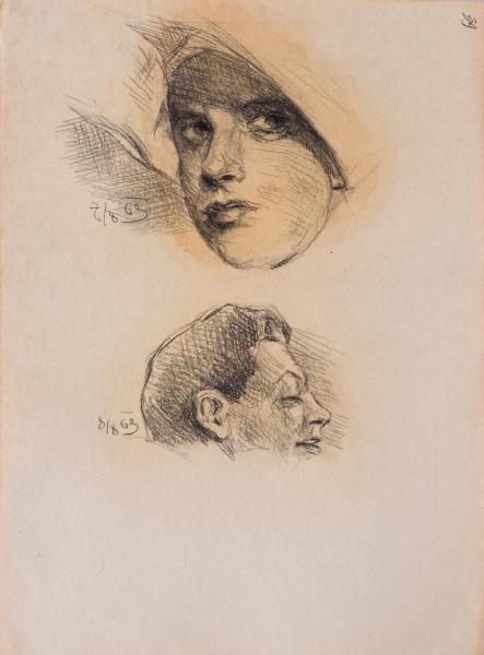 The sheet contains two separate portrait images drawn in pencil. They are presented without any plot or compositional connection and resemble educational and research sketches. The upper part of the sheet depicts an oval of a woman's face, slightly turned towards the viewer. There is no visual context, no distinct background or clothing details. A headdress is visible on the head, which may resemble a Catholic cornette in shape. The treatment of the face is generalised, linear, without detailed chiaroscuro modelling; the focus is on the correctness of the proportions and silhouette. Below is a second image – a partial profile of the head, from the crown to the lower lip. The gender of the model remains uncertain; however, based on the character of the features, it can be assumed that this is a male face. The drawing emphasises the shape of the forehead, nose, and lips, creating a distinctive profile, although the rest of the details are missing. Both sketches are executed in a generalised manner, with minimal use of tonal means. Their construction indicates the exploratory nature of the work, focused on studying the plasticity of the face from different angles and with varying degrees of completion.