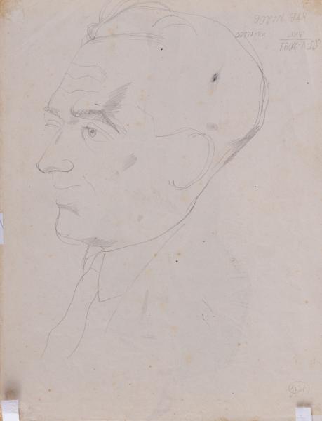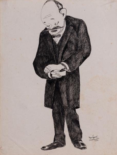 A grotesque full-length portrait of a man. The figure is somewhat disproportionate, characterised by short legs, long arms crossed over the stomach, broad shoulders, a large head tilted slightly downward, and large ears. The man has a protruding forehead with deep wrinkles, a sharp nose, a moustache sticking out to the sides, raised eyebrows, small eyes, and his gaze is directed at a piece of paper in his hand. On the reverse side: a sketch portrait of a man in profile, done in pencil.