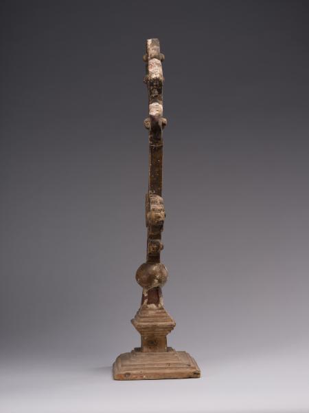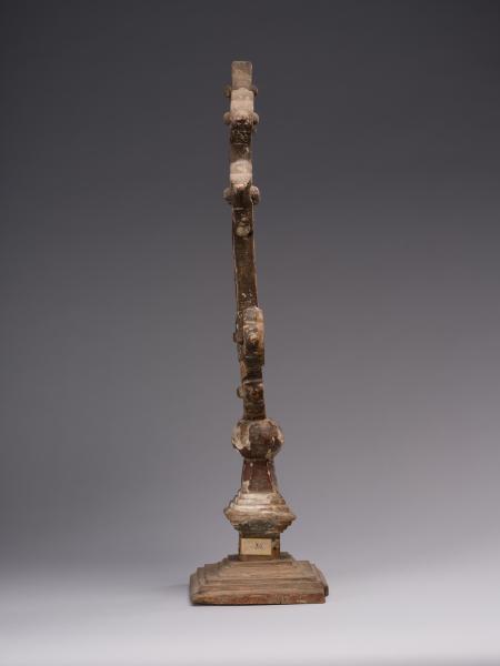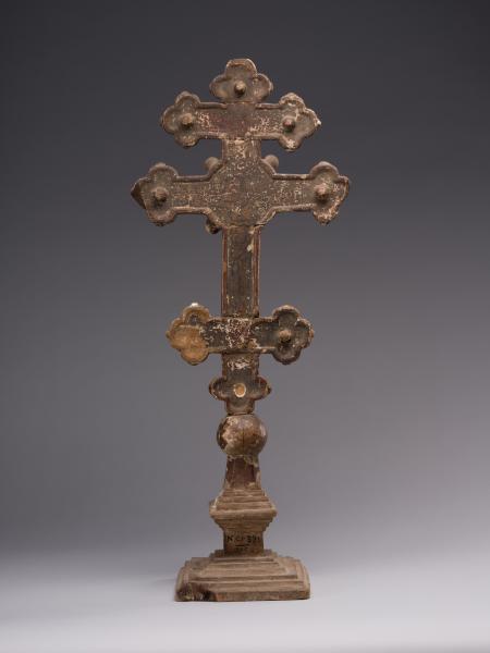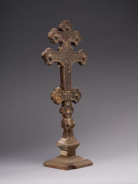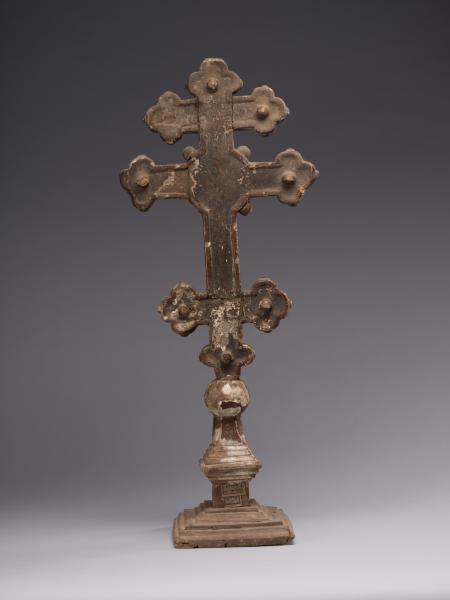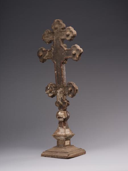 The altar features a wooden three-barred cross on a square relief base, which has a complex form with broadened ends carved in the shape of triple-lobed terminations. The work belongs to the iconographic type of the blooming cross. At the ends of each arm are rounded projections – decorative overlays or studs emphasising the sacred purpose of the object and its connection with the Golgotha Crucifixion. On the front side of the central shaft and the middle crossbeam, there is a faintly discernible polychrome image of the Crucified Christ. The outlines of the nimbus, the facial features, and the figure in a perizoma, a loincloth at the hips, can be distinguished, rendered in a manner characteristic of folk masters, where the graphic contour plays the principal role. The surface has lost a significant part of its original painted layer and coating, yet remnants of a dark brown and golden-greenish tonality remain, which once imparted solemnity to the work. The reverse side has also preserved traces of a painted drawing with an iconographic depiction of the Baptism of Christ. On the central shaft, the graphic figure of Christ is represented, above whom is a dove – the symbol of the Holy Spirit. Despite significant damage and loss, the altar cross has retained its monumental and powerful presence. The traces of paint and the graphic features of the central images make it possible to envisage the original brightness of the composition, while the marks of ageing lend it a particular resonance. The altar cross is an example of a wooden sacred sculpture that combines symbolism, decorativeness, and liturgical function.