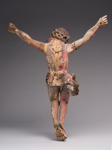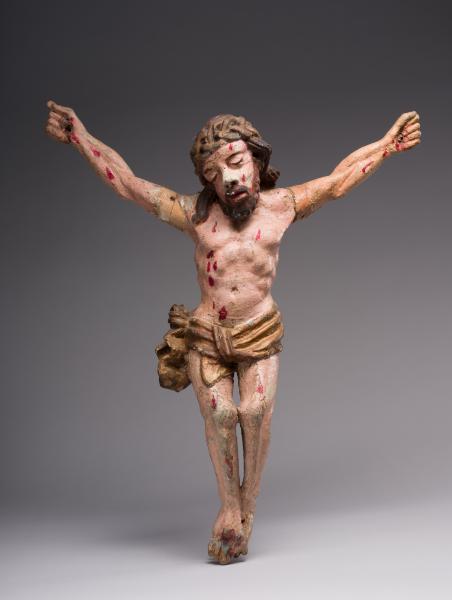 The polychrome figure of Christ crucified is carved in imitation of Western iconography. The stocky body is rendered with pronounced naturalism. The master carefully conveyed the anatomical features: an athletic figure, a tense chest, clearly defined ribs, a sunken abdomen, and well-defined muscles in the arms and legs. The arms are spread wide with closed palms, without strong tension, the legs are crossed, and the wounds on the body are clearly visible, leaving bloody traces – all aimed at conveying the dramatic nature of the scene. Jesus' head is slightly tilted to the right, his eyes closed, emphasising the end of his earthly suffering. His elongated face, framed by wavy carved lines of chestnut hair and a short wedge-shaped beard, conveys the sorrow and tranquillity of death. On his head is a crown of thorns, modelled with intertwined rods. Christ's naked body is covered with a loincloth tied in a knot on the right side. The deeply carved folds of the loincloth on his hips add decorative elements to the sculptural image. Overall, this work embodies the sacred themes of suffering and salvation, where artistic language serves as a means of drawing the viewer closer to the mystery of Christ's sacrifice.