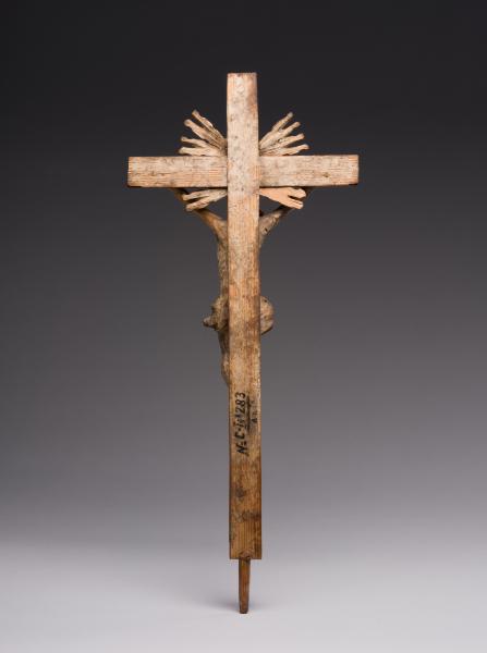 The sculpture depicts part of an altar cross, with Christ crucified at its centre. Behind him are carved rays of light, symbolising the divine light that illuminates Jesus even at the moment of his death. The crucifixion is rendered in the traditional Western iconographic style. The figure is depicted at the moment of suffering on the cross. The elongated body is fragile, with a distinct, dramatic curve. Arms stretched upwards, bent legs, head tilted to the right – these details convey a sense of suffering and at the same time submission. Christ's naked body is covered only by a carved drapery on his hips, whose dynamic folds enhance the emotional tone of the work. The sculptural image combines elements of professional skill with the expressive sincerity of folk art. The image appears as the embodiment not only of Christ's suffering, but also of eternal hope.