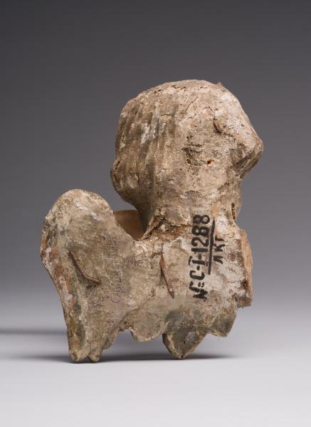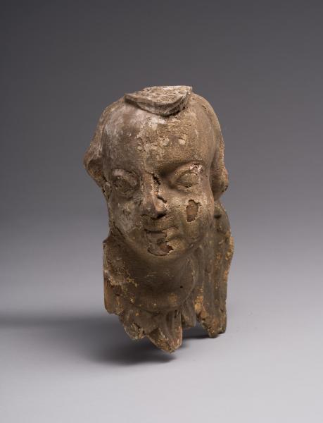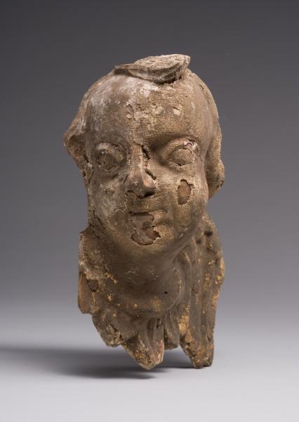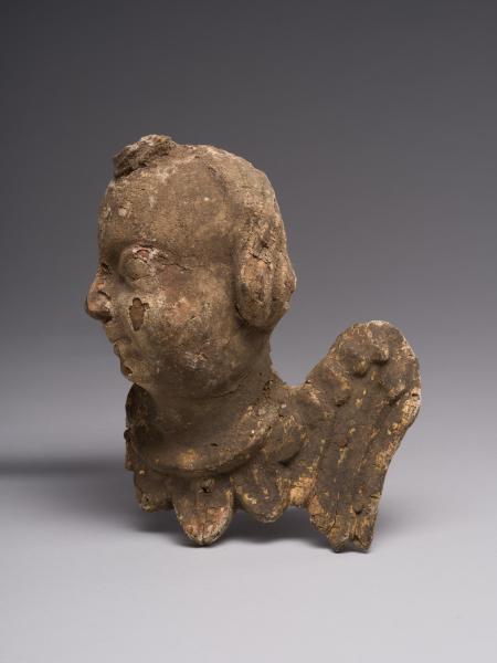 The sculpture of a cherub served as a decorative element in a sacred space. The angel's head has been partially preserved, with fragmentary traces of decoration remaining, which give an idea of its original decorative splendour. The rounded face with generalised features resembles a child's face, characteristic of Baroque sacred sculpture, symbolising purity and harmony. The cherub's gaze, directed to the side, gives the image liveliness and spaciousness. Wings are placed at the bottom of the head, generalised with a relief that imitates the texture of feathers. The sculptural image of the cherub exhibits a harmony of proportions, smooth lines, and a decorative role for the wings. The touching innocence is emphasised by the simplicity of forms, the absence of sharp details, and the smoothness of the outlines. Despite the losses, the form has remained expressive, allowing us to see the artistic idea.
