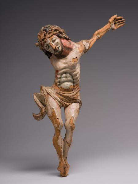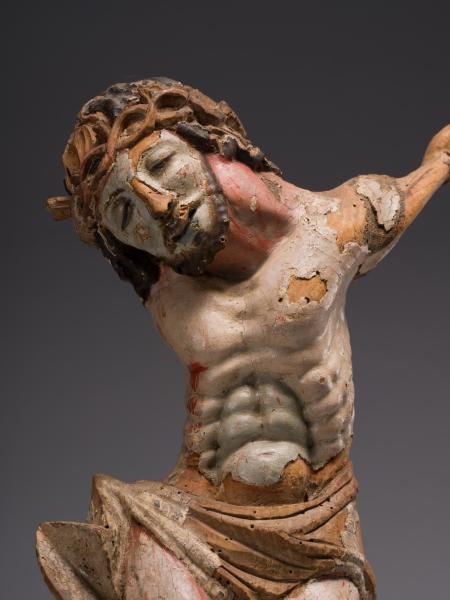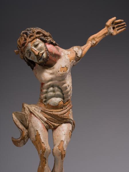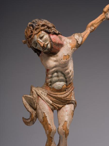 The image of Christ Crucified is a staple of Western iconography, where the Saviour is depicted at the moment of death. His body is tilted to one side, his head is bowed to his chest, and his eyes are closed. The plasticity of the body is distinguished by a generalised but eloquent rendering of anatomical features. The master texturally reproduces the chest with a sunken, relief-carved abdomen. Christ's arms (the right one is missing) are spread wide, his palms are open, devoid of extreme tension, his legs are bent, creating a dramatic effect and visual rhythm. Despite the dramatic nature of the moment, the image is filled with silence and acceptance. Christ's body is covered at the hips by a perizoma, modelled with shallow folds carved with a chisel, the ends of which create an effect of movement, dynamically fluttering. The influence of Baroque expression is evident in the curves of the body, the tension of the muscles, and the dynamics of the drapery. In this work, the author seeks to convey spiritual content rather than to perfectly reproduce anatomical features.