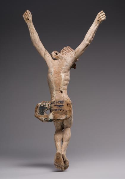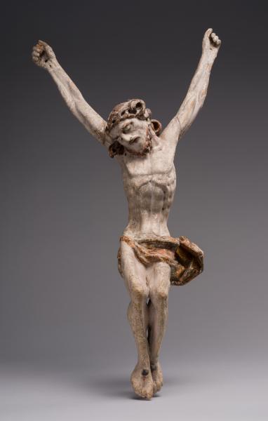 The image of the Crucified Christ follows the Western iconographic tradition. The Saviour is presented at the moment of death upon the Cross: the head bowed, the eyes closed, the body elongated and slightly curved to the left, with a crown of thorns upon the head – a symbol of humiliation and suffering. The figure of Christ is rendered in a generalised manner, without excessive naturalism, yet with an emphasis on suffering and exhaustion. The raised, tensely outstretched arms, the legs bent at the knees, and the characteristic curve of the body impart dramatic tension to the composition. The master plausibly conveys the anatomical features of the human body: the carefully carved rib cage, the sunken abdomen, the torso with a clearly defined waist, and the articulated muscles of the arms and legs. The calm expression of the weary, texturally detailed face creates an impression of sincerity and profound spirituality. Everything in the image underlines the completion of earthly suffering. The naked body is covered at the hips by a perizoma, modelled volumetrically so as to create an impression of plasticity and movement. Despite the dramatic nature of the moment, the image is imbued with a sense of silence and reconciliation. The master has succeeded in combining the realism of torment with spiritual grandeur, elevating the image beyond a mere sculptural representation – it becomes a symbol of sacrifice and boundless love.