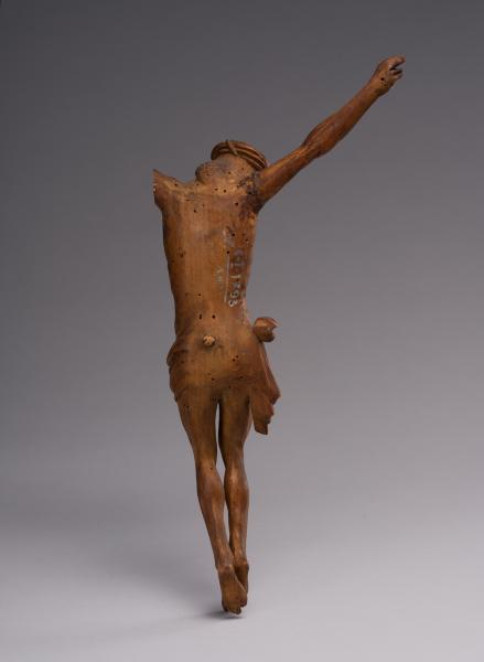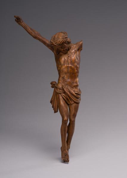 The sculptural Crucifixion is made in accordance with traditional Western iconography. The figure is depicted at the moment of suffering on the cross. Christ is depicted with his head bowed, topped with a crown of thorns. His face is refined, with soft features, giving the image a sad and mournful expression at the same time. The elongated figure is naturally modelled, reflecting the artist's desire to convey the anatomical features of the human body. The muscles, the relief of the chest and abdomen, and the knee caps are clearly defined. The arms are spread apart, the legs are stretched out and crossed, and the opening from the nail is visible on them. The loincloth on the hips is carved with particular care: the folds of the fabric resemble dynamic movements, creating an effect of lightness and lively texture. The deeply emotional image of Christ in the work is distinguished by a combination of tragedy and spiritual peace.