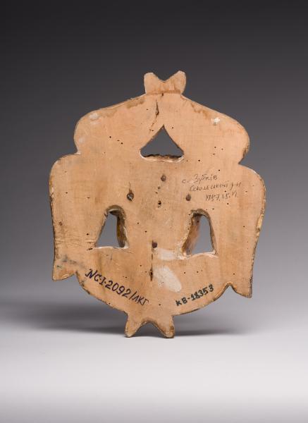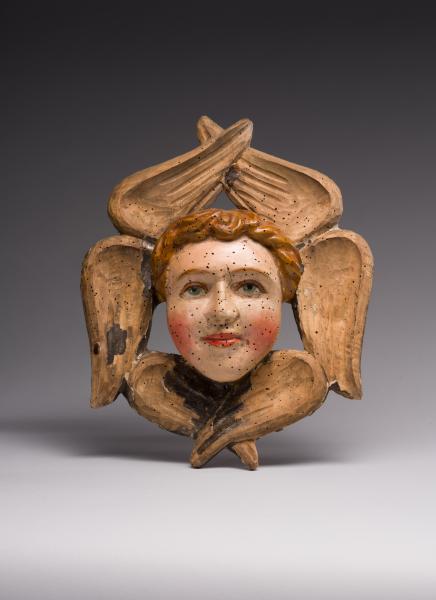 The carved wooden head of a six-winged seraph is a typical motif in art, used to decorate the interiors of sacred buildings. The bright, clearly carved face of the angelic head has distinctive features. Large, grey-green eyes with a slight sparkle, rosy cheeks, and expressive lips with a gentle smile convey a sense of gentleness and heavenly peace. The facial features, harmoniously emphasised by polychromy, combine childlike spontaneity and angelic harmony. The image is made more expressive by the neatly arranged curls of light brown hair framing the face. Seraph appears as a symbol of heavenly joy and peace, with soft, rounded features reminiscent of childhood innocence. The wings, which fold around the head, form a decorative halo, creating a sense of flight and heavenly radiance. Deep lines imitating feathers add movement to the plastically carved wings.