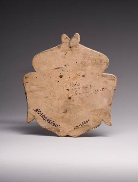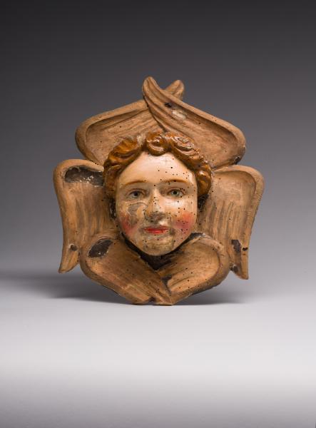 The carved wooden head of a six-winged seraph is a typical motif in art, used to decorate the interiors of sacred buildings. The bright, clearly carved face of the angel's head has distinctive features. Large, grey-green eyes with a slight gleam, rosy cheeks, and expressive lips with a gentle smile convey a sense of gentleness and heavenly peace. The facial features, harmoniously emphasised by polychromy, combine childlike spontaneity and angelic harmony. The image is made more expressive by the neatly arranged curls of light brown hair framing the face. Seraph appears as a symbol of heavenly joy and peace, with soft, rounded features reminiscent of childhood innocence. The wings, folded around the head, form a decorative halo that creates a sense of flight and heavenly radiance. Deep lines imitating feathers add movement to the plastically carved wings.