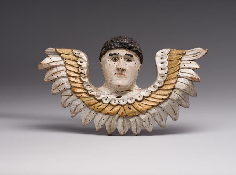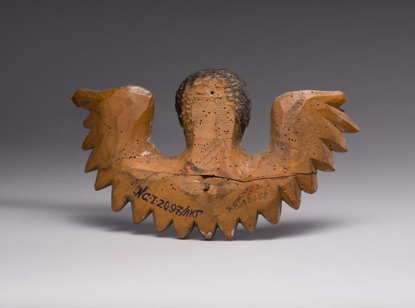The symbolic image of a cherub is carved in a manner characteristic of folk artists. The face is simple and somewhat stern, devoid of lavish idealisation, yet expressive. The light complexion of the face contrasts sharply with the dark colour of the hair, giving the image a dramatic tone. The small, somewhat disproportionate, deep-set eyes convey inner concentration, and the frozen expression of the lips with their downturned corners creates a sense of seriousness and imperturbability. The wings, full of decorative rhythm, are carefully carved and drawn with an emphasis on dark and light tones, which to some extent balance the severity of the face. The image does not so much emphasise angelic tenderness as personify a guarding and protective essence. The work reveals the artist's desire to combine realistic human features with the symbolism of heavenly forces, creating an archaic yet monumental interpretation of a cherub.