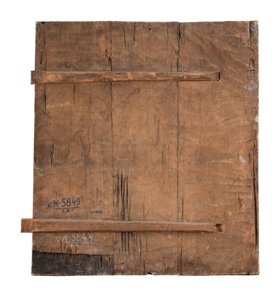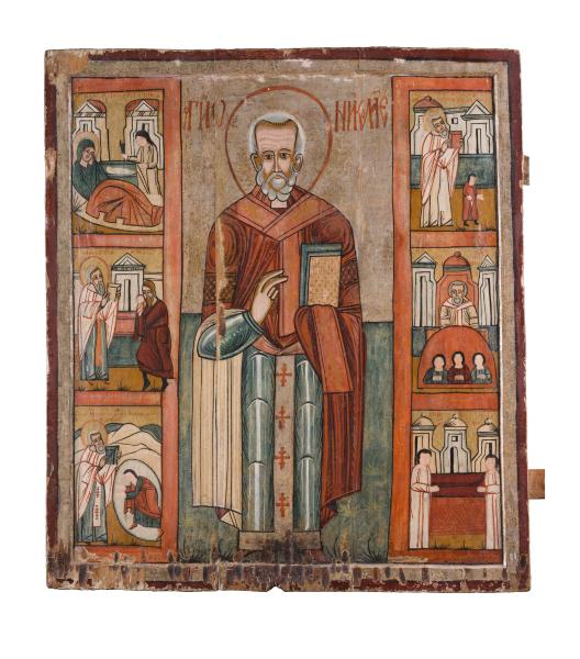 Nicholas of Myra (also known as Nicholas the Wonderworker) is one of the most popular saints, whose cult originated in Byzantium and later spread to Ukraine. The flat, full-length figure of the saint on the icon from the church in the village of Topilnytsia fills the entire centre with a light background and a high olive-green border. Saint Nicholas is depicted with grey hair, a round beard, and short hair. In his left hand, he holds the Gospel, and with his right hand, he blesses. On either side of the saint are three stamps depicting events from his life and deeds. His elongated, ascetic face with a high forehead crossed by furrows of wrinkles is modelled with red ochre. The figure of Saint Nicholas is anatomically disproportionate. The dark, clear lines of the folds in his clothing, together with the vertical white strokes of light on his green chiton, reinforce the flatness and graphic nature of the image, which is emphasized by the expressive dark outline. The composition of the icon is compact, rendered in broad colours, without excessive detail or emphasized decorative elements. Markings: 1. The Nativity of Saint Nicholas. 2. The liberation of Agrik's son from Saracen captivity. 3. The baptism of Nicholas. 4. The visit of three men to the dungeon. 5. The rescue of the drowning Demetrius. 6. The transfer of the relics of Saint Nicholas from Myra in Lycia to Bari.