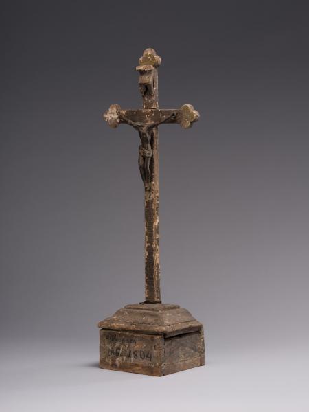 The wooden cross with a Crucifix is presented on a carved square base. The three ends of the cross terminate in rounded leaves – a form widely used in Ukraine, particularly on altar crosses. The triple termination symbolises unity, harmony, and perfection, associated with the Holy Trinity. On the horizontal beam, the sculptural figure of Christ is fixed, executed in traditional Western iconography: outstretched arms nailed to the cross with closed palms, legs crossed with one foot placed over the other, head tilted to the right, and crowned with a crown of thorns. The body of the Saviour is modelled with a pronounced emphasis on anatomical accuracy, with clearly defined ribs, abdomen, and musculature of the arms and legs. A significant feature of the sculptural representation is the slenderness of Christ’s figure. The polychrome base is of interest not so much for its original painting as for the inscription, which indicates that the altar cross was restored in 1864. The work combines naivety and simplicity of execution with profound spiritual content characteristic of folk craftsmen.