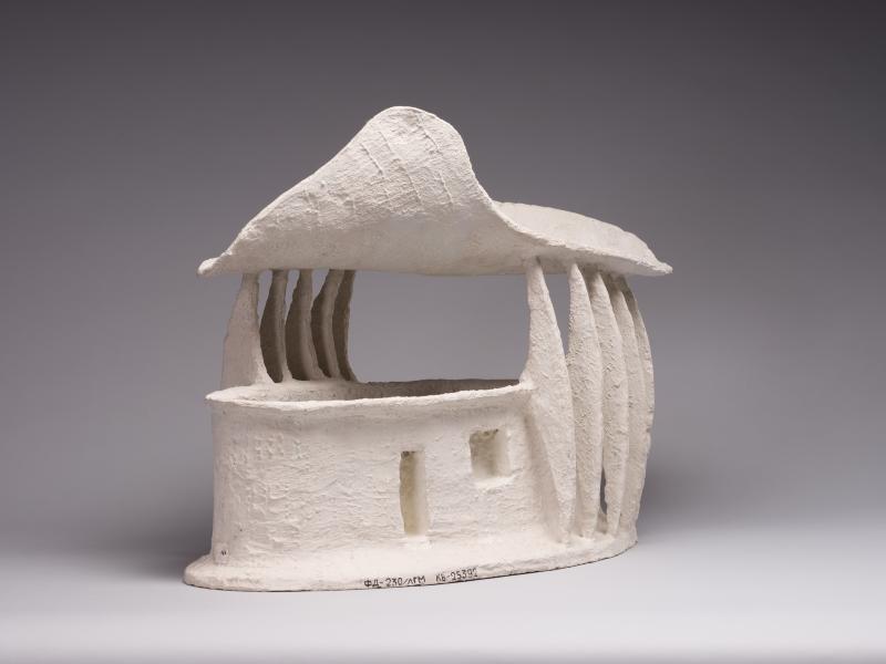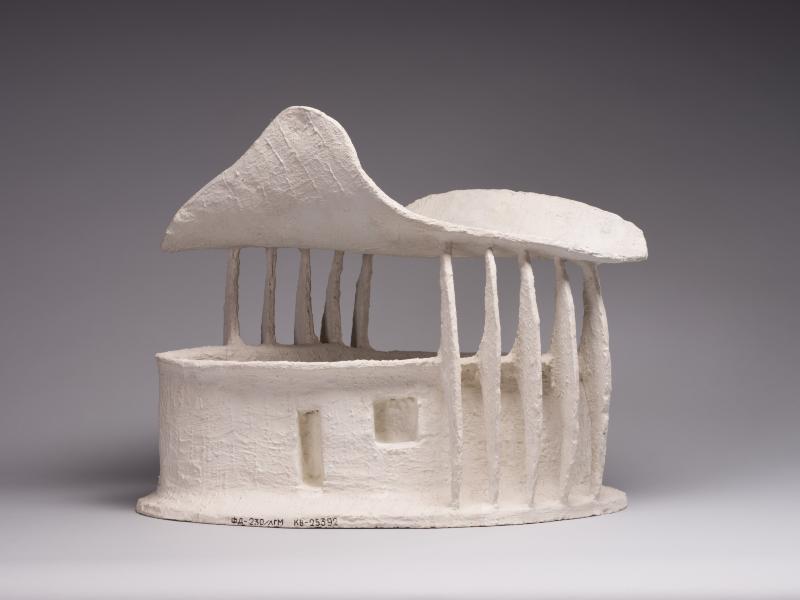 In 1964, during one of the group exhibitions, Dzyndra “met the brilliant Ukrainian master Oleksandr Arkhypenko” and, “upon returning home, destroyed all his ‘thematic sculptures’”. The subsequent decades were marked by a rejection of representational art and a turn toward “contemporary-style sculpture”, with experiments in the concepts of “sculpture of plastic associations”, “abstract sculpture of free form”, and “sculpture of architectural form”, as well as the creation of relief abstract compositions, grotesque portraits, and graphic and pictorial works.
