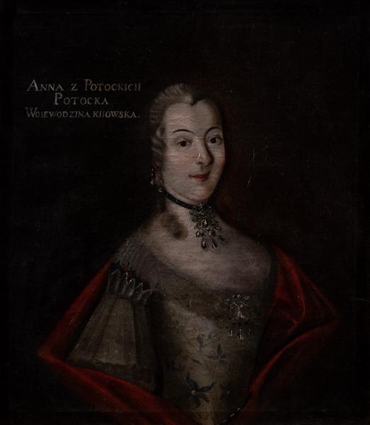 Anna Potocka (1724–1772) – daughter of Stanislaw Potocki, Voivode of Poznan, and Marianna Leszczowna. Wife of Franciszek Salezy Potocki, Voivode of Kyiv. She was a possessive and despotic woman. Anna Potocka's depictions were often imbued with sarcasm. The half–length portrait is made according to the traditions of secular portrait painting of the 18th century, which is characterized by flat treatment of the subject. It has a rich colour scheme, excessive detailing of the figure and accessories, flat manner of execution and festiveness which are typical for primitivist painters. Stylistic changes in Ukrainian portraiture coincided with the changes which occurred in European painting. Women were drawn in stylish European gowns and wigs, a smile appeared on their lips, which is how the artist depicted Anna Potocka, trying to endow the work with an emotional appeal. At the top of the portrait there is an inscription: “Anna z Potockich Potocka Woiewodzina Kiiowska”.