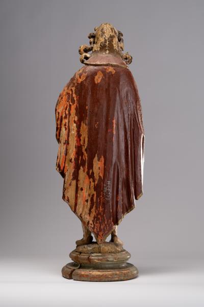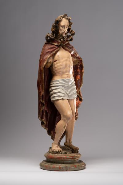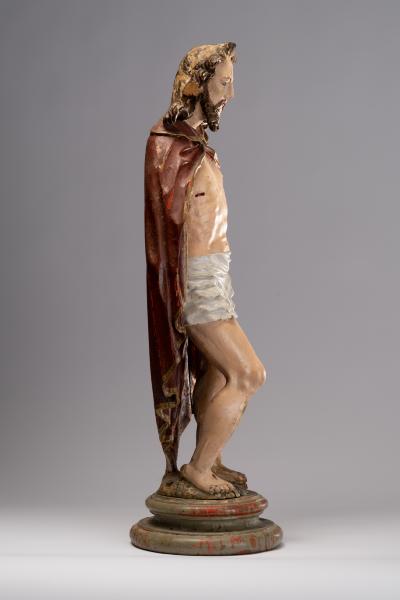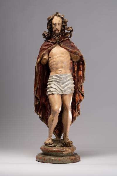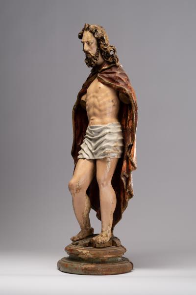 The sculpture of the Ascension of Christ represents a frontal, full-length contrapposto image. Traditionally, such a single sculpture was placed on a tetrapod at Easter. The saint's figure imitates Western iconography, which became widespread in Ukraine in the 16th century. Christ is dressed in a loincloth around his hips and a long red robe fastened at the chest, which falls downwards freely. Jesus' clothing is sculpted with recessed planes and rounded edges. The carefully anatomised, athletically built body demonstrates the master's skill. The figure's head is framed by long strands of wavy hair and a short, split beard, which seem to float in the wind, adding expression to the sculpture. The ascetic, elongated face of Christ is stern but calm.