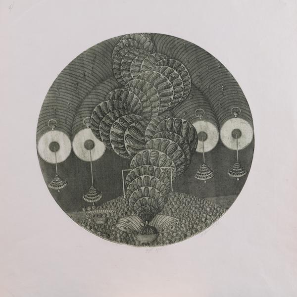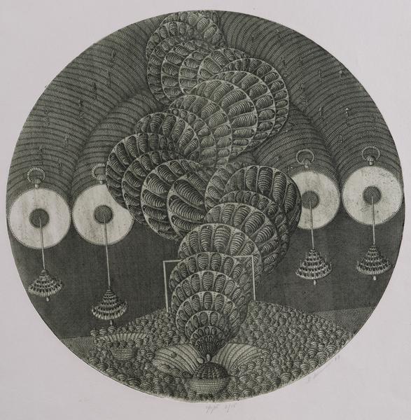 The author resorts to using the composition scheme of the previous etchings of the series. He depicts a circle with a curly rough ribbon crossing it vertically. This zoomorphic S-shaped spiral meta-whirligig, in this case, adds dynamism to the static composition as a whole. The spiral resembles an eyeless snake with its mouth stuck into the segment's crater formed by a swarm of whirligigs. Actually, it is the birth of a tornado in the crater. The crater looks like an inverted hat, containing a sphere with a faceted coating of diamond rust.