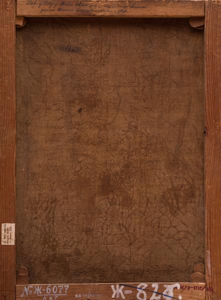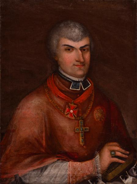 The painting depicts Count Andrzej Alojzy Ankwicz (1777–1838), a Roman Catholic bishop who served as the Archbishop of Lviv from 1815 to 1833. He studied in Krakow and Vienna. He was ordained in 1810. He served as a canon, rector of the seminary, and director of the theological cabinet in Olomouc (Czech Republic). In 1815, he was appointed Archbishop of Lviv and was consecrated as a bishop that same year. Ankwicz is remembered in history as an energetic organiser who cared for the discipline of the clergy and the development of liturgical practices. He also cared for public education. As a politician, he supported the policies of the Habsburgs. In 1817, he received the title of Primate of Galicia and Lodomeria from the Austrian Emperor. From 1817 to 1818, he was a rector of Lviv University. In 1833, he was transferred to the position of Archbishop of Prague, where he is buried in the Archcathedral of St. Vitus. He was awarded the Knight's Cross of the Order of Leopold. The portrait depicts the man as a legatus natus of the Kingdom of Bohemia.