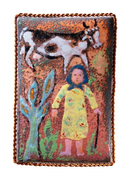 From the series "Hutsul folk beliefs". On a copper plate, on an ochre background, a girl (shepherdess) is depicted with a stick in her left hand. To her left is a stylized tree, behind her is a spotty cow.