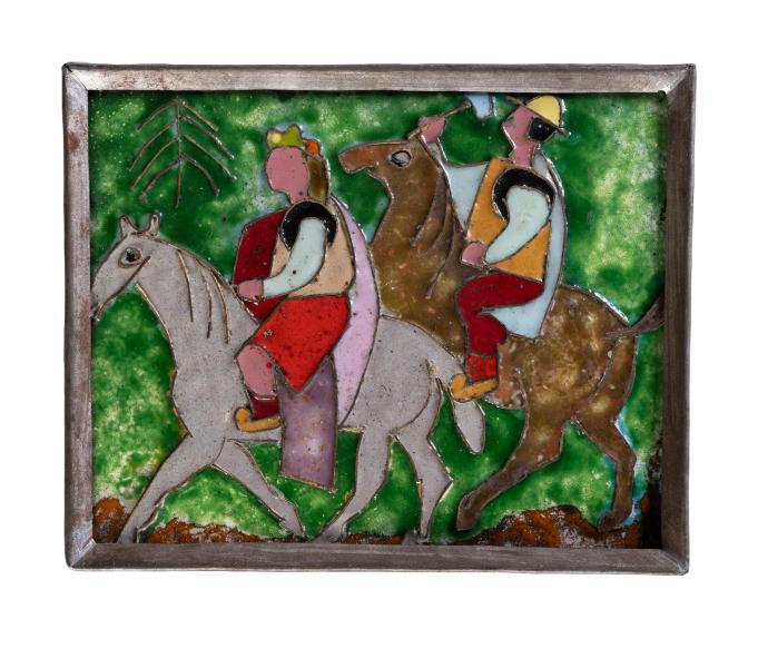 Yaroslava Muzyka (Stefanovych) was born in Zaliztsi in Ternopil region on January 10, 1894. She died on November 24, 1973, in Lviv. She was an artist of diverse preferences and talent. She turned to graphic art – linocuts, woodcuts, drypoint, monotype; painting – oil, tempera, gouache, encaustic; mosaic and enamel, on glass, grattage on gold or silver foil, batik, embossing on leather, embossing on metal. She studied drawing and painting at Leonard Podhorodecki Free Academy of Fine Arts in Lviv and André Lhote Academy in Paris. In 1928, she trained as an art restorer at the Central State Restoration Workshop of Ihor Grabar in Moscow. She also worked at the National Museum in the restoration workshop. Yaroslava Muzyka was one of the founders of the Association of Independent Ukrainian Artists (AIUA), a Ukrainian public art organization that operated in Lviv from 1931–1939. In 1937, the artist learned the difficult technique of burning enamel objects by attending Mariia Dolnytska classes in Lviv. In addition, she studied on her own using French and German enamelling manuals. The artist worked in the technique of bulk (scenic, painted) and cloisonne enamel. Her favourite subjects in the enamel works were Hutsul demonology, pagan mythology, beliefs of ancient Slavs, the works by Taras Shevchenko, images of animals, and female portraits.