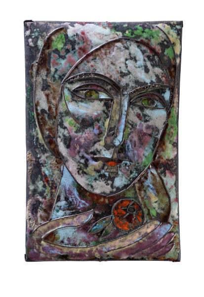 Yaroslava Muzyka (Stefanovych) was born in Zaliztsi in Ternopil region on January 10, 1894. She died on November 24, 1973, in Lviv. She was an artist of diverse preferences and talent. She turned to graphic art – linocuts, woodcuts, drypoint, monotype; painting – oil, tempera, gouache, encaustic; mosaic and enamel, on glass, grattage on gold or silver foil, batik, embossing on leather, embossing on metal. She studied drawing and painting at Leonard Podhorodecki Free Academy of Fine Arts in Lviv and André Lhote Academy in Paris. In 1928, she trained as an art restorer at the Central State Restoration Workshop of Ihor Grabar in Moscow. She also worked at the National Museum in the restoration workshop. Yaroslava Muzyka was one of the founders of the Association of Independent Ukrainian Artists (AIUA), a Ukrainian public art organization that operated in Lviv from 1931–1939. In 1937, the artist learned the difficult technique of burning enamel objects by attending Mariia Dolnytska classes in Lviv. In addition, she studied on her own using French and German enamelling manuals. The artist worked in the technique of bulk (scenic, painted) and cloisonne enamel. Her favourite subjects in the enamel works were Hutsul demonology, pagan mythology, beliefs of ancient Slavs, the works by Taras Shevchenko, images of animals, and female portraits.