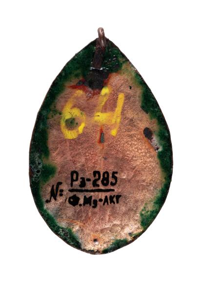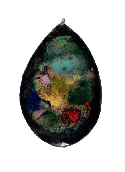 Female jewellery - a pendant. Geometric shape in the form of an oval with a pointed top end. Black enamel on the edges, multicoloured spots in the centre - green, yellow, pink, blue and red.