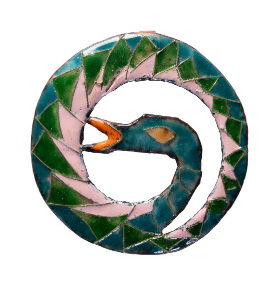 The pendant is shaped like a snake, with its head in the centre and its body forming a spiralling circle.