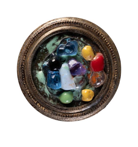 The pendant is round. The surface of the green pendant is chaotically arranged with colourful pieces of glass and enamel.