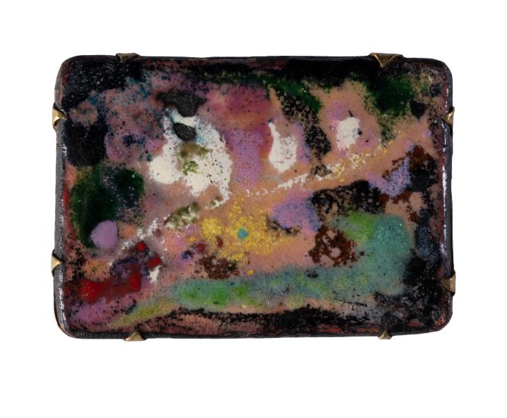 Yaroslava Muzyka (Stefanovych) was born in Zaliztsi in Ternopil region on January 10, 1894. She died on November 24, 1973, in Lviv. She was an artist of diverse preferences and talent. She turned to graphic art – linocuts, woodcuts, drypoint, monotype; painting – oil, tempera, gouache, encaustic; mosaic and enamel, on glass, grattage on gold or silver foil, batik, embossing on leather, embossing on metal. She studied drawing and painting at Leonard Podhorodecki Free Academy of Fine Arts in Lviv and André Lhote Academy in Paris. In 1928, she trained as an art restorer at the Central State Restoration Workshop of Ihor Grabar in Moscow. She also worked at the National Museum in the restoration workshop. Yaroslava Muzyka was one of the founders of the Association of Independent Ukrainian Artists (AIUA), a Ukrainian public art organization that operated in Lviv from 1931–1939. In 1937, the artist learned the difficult technique of burning enamel objects by attending Mariia Dolnytska classes in Lviv. In addition, she studied on her own using French and German enamelling manuals. The artist worked in the technique of bulk (scenic, painted) and cloisonne enamel. Her favourite subjects in the enamel works were Hutsul demonology, pagan mythology, beliefs of ancient Slavs, the works by Taras Shevchenko, images of animals, and female portraits.