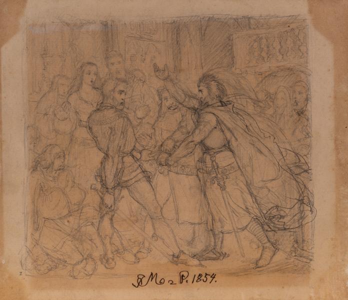 Адам Міцкевич (1798–1855) написав баладу «Лілеї» (1820) за мотивом польської народної середньовічної пісні «Убила пані пана» («Pani zabiła Pana»). Ескізна робота Я. Матейка є ілюстрацією до фінальної сцени з балади, коли примара Пана – убитого своєю дружиною чоловіка, з’являється в костелі в день весілля, щоб забрати з собою у потойбічний світ невірну дружину і двох своїх братів, які сваталися до неї. В центрі динамічної багатофігурної композиції – три чоловічі фігури в середньовічному вбранні й з мечами у руках. Двоє з них (брати вбитого Пана) налякані появою третього чоловіка, який є привидом. Зліва за ними – злякана молода жінка, головна героїня поеми (Пані). Чоловік-привид (зображений праворуч у плащі) обурений тим, що відбувається. Він підносить праву руку догори та гнівно промовляє до братів і дружини-вбивці. Відображена сцена – мить до того моменту, коли все буде поховано під руїнами костелу.