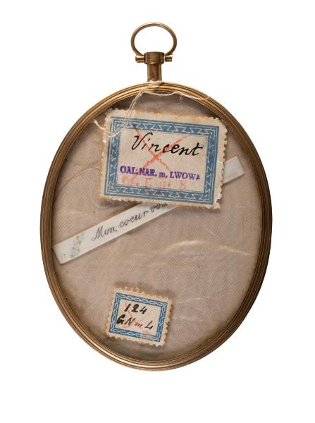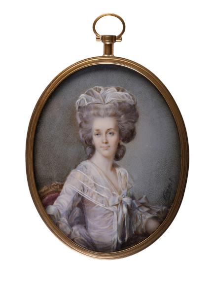 Мініатюра є парною до роботи «Портрет Жака Неккера» і також намальована за олійним портретом Жозефа Дюплессі (Joseph-Siffred Duplessis) (після 1781 р.), що зберігається в замку Коппет. На олійному поколінному портреті Сузанна Неккер зображена в білій сатиновій сукні (можливо, шлюбній) за тогочасною модою. На відміну в мініатюрі – поясний портрет і колір сукні змінений на рожевий. Волосся зображеної укладене в пишну зачіску з буклями і прикрашене білим прозорим бантом. Мініатюра у бронзовій позолоченій овальній рамці з випуклим склом на аверсі і реверсі. На звороті навкіс розміщена пластинка зі слонової кістки з написом “Mon Coeur vous reste” (Моє серце залишається Вам).