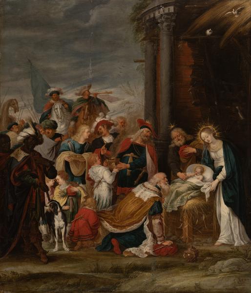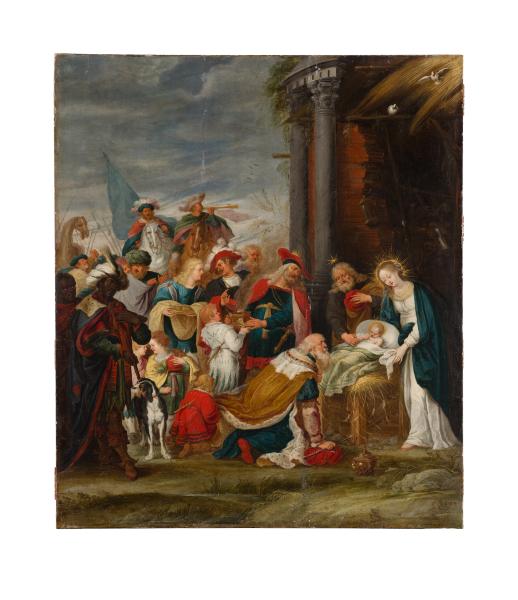 Твір є яскравим прикладом живописного стилю Корнеліса де Бальєра. Композиція, імовірно, була виконана під впливом зразків нідерландської гравюри XVI століття, зокрема, «Поклоніння Волхвів» Гендріка Гольціуса. На картині зображено трьох царів: Гаспара, Мельхіора та Бальтазара, які принесли дари Ісусу Христу. Перед ними – Святе Сімейство: Діва Марія, яка з благоговінням дивиться на Дитя, а поруч Йосиф обережно бере його за руку. Святе сімейство перебуває у напівзруйнованому античному храмі, що, вірогідно, символізує перемогу християнства над язичництвом. Над головною сценою видно зішестя Святого Духу, присутність якого символізують два білі голуби та яскраве золотисте сяйво. Перед ними стоїть на колінах Гаспар, який поклоняється Христу, спершись рукою на червону подушку. Позаду, в натовпі, бачимо Мельхіора, якому юний паж передає шкатулку з ладаном. Зліва – Бальтазар, який, відповідно до іконографічної традиції в нідерландському живописі, зображений темношкірим. Біля нього – слуги. Іконографія твору відповідає сформованій у середньовіччі доктрині, згідно з якою кожен з царів представляє один із відомих на той час континентів. Відповідно, Гаспар репрезентує Азію, Бальтазар – Європу, Мельхіор – Африку. Художник зобразив трьох царів у відповідних шатах.