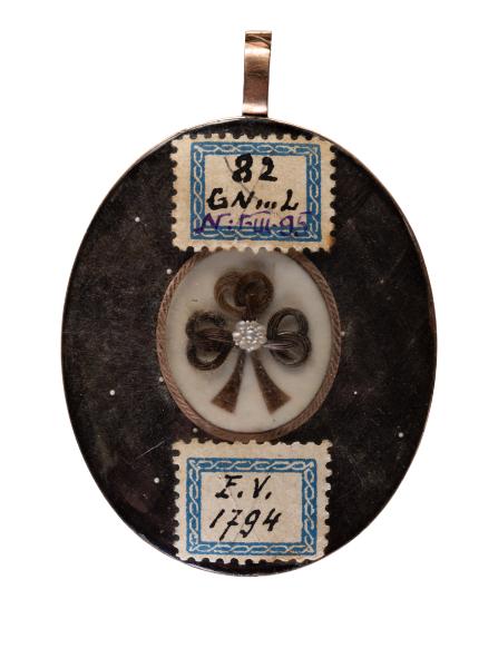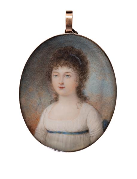 На фоні неба поясне зображення молодої жінки, представленої у ¾ звороті вліво, з поглядом, спрямованим удалину. На її голові – темне кучеряве волосся, що спадає на шию. Жінка вбрана в білу декольтовану сукню з голубим вузьким поясом.
