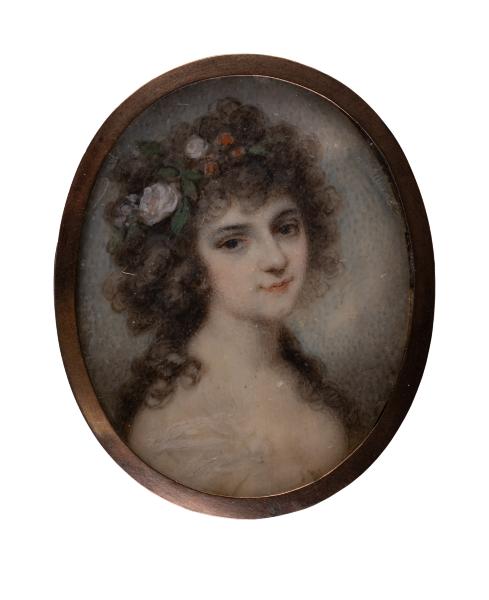 На сіро-голубому фоні погрудне зображення молодої жінки, представленої у ¾ звороті вправо, з поглядом, спрямованим на глядача. Волосся довге, в локонах, спадає на плечі, прикрашене червоними і білими трояндами. Сукня біла.