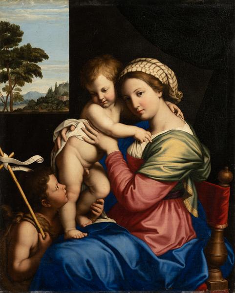 Із творчістю Рафаеля полотно «Мадонна з дитям» зі збірки ЛНГМ ім. Б.Г. Возницького споріднюють тонка поетичність та ідеалізація образів, урівноваженість композиції, вписаної у трикутник, локальний колорит, м’яка пластика форм, плинність ліній, вікно на другому плані, за яким видніється ідеалізований узагальнений пейзаж, заснований на інтерпретації природи як осередку гармонії. Усталеній іконографії відповідає зображення Марії, Іоанна Хрестителя, немовляти Ісуса, обриси тіла і рухи якого, поряд з активністю бганок драперій, надають полотну маньєристичних і барокових ознак. Водночас техніка письма і потрактування образу Богоматері вказують на зв’язок із болонською художньою традицією.