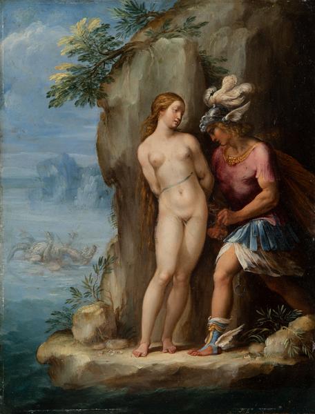 Героя давньогрецької міфології прославив подвиг звільнення Андромеди. Після перемоги над Медузою Горгоною Персей сів на коня Пегаса, що народився з тіла мертвої Медузи, i полетів над морем. Наблизившись до берега, побачив прикуту до скелі прекрасну Андромеду, доньку царя Ефіопії Кефея. До неї з глибин моря наближався дракон. Чудовисько наслав на Ефіопію Посейдон, щоби помститися цариці Касіопеї, яка вихвалялася, що є красивішою за всіх нереїд. Аби спокутувати провину матері, Андромеду принесли в жертву. Вражений красою дівчини, Персей убив дракона і звiльнив Андромеду. Відтворення цього сюжету відоме у кількох варіантах, створених упродовж 1593–1612 років. На більшості робіт Персея зображено в польоті верхи на Пегасі з мечем у руці, готовим до бою з драконом. Лише у львiвськiй картині він представлений поруч з Андромедою після перемоги над чудовиськом. Зважаючи на стилістичне порівняння, галерейний твір можна датувати періодом бл. 1610 року. Однак важко визначити ступінь участі самого Джузеппе Чезарі у написанні роботи, адже, окрім інших представників майстерні, які наслідували манеру художника, поруч з ним працював його брат Бернардіно Чезарі.
