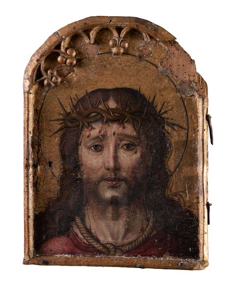 Бліде обличчя та багряний одяг Христа виділяються на золотому тлі. Ретельно промальовано кожну деталь: шипи, що встромилися в його чоло, кров, що капає по обличчю, і сумний погляд, який передрікає свої неминучі страждання і смерть на хресті. Це зображення Христа традиційно відоме як «Ecce Homo» («Се людина») або «Христос, увінчаний терном». Згідно з Біблією (Івана 19:5), римські воїни били і знущалися з Христа перед розп’яттям. Вони одягли його в багряницю і поклали йому на голову терновий вінок зі словами: «Радуйся, Царю Юдейський». Потім Понтій Пілат, римський правитель, показав Христа натовпу і сказав: «Ось чоловік», як представлено у творі. Такі невеликі картини на релігійну тематику використовувалися для приватної молитви. Вони були популярними як серед заможних, так і серед звичайних сімей, адже співпереживання з розп’ятим Христом було важливою рисою духовності епохи Відродження. Художники робили акцент на втіленому божестві, що підкреслювали полірованим золотим фоном та німбом. Ця незвичайна робота має певний емоційний вплив на глядача. Невеликий розмір твору свідчить про те, що його було призначено для огляду зблизька, щоб справити максимальне враження, викликаючи жалість. Власник, який замовив цю роботу для своєї приватної кімнати, міг стати перед нею навколішки, розмірковуючи про біль Христа.