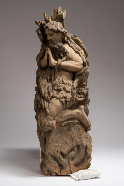Іконографія пустельника Онуфрія розвинулась від однофігурних композицій до сцен, що відтворюють його життя. Зображення святого здебільшого зустрічаються в іконописі, гравюрі та скульптурі. Фігура св. Онуфрія вирізьблена із суцільного шматка дерева. Аскетичний старець-пустельник, повен впевненості та великої сили волі, стоїть на колінах з молитовно складеними руками. Обличчя чоловіка добре змодельоване, з виразними великими очима, що випромінюють спокій та впевненість у своїх переконаннях. Основна увага приділена довгій бороді та волоссю, що вважаються головними в образі св. Онуфрія, – вони легкими й плавними вертикальними лініями-хвилями спадають додолу, прикриваючи оголене тіло. Декоративним акцентом у скульптурі є набедрена пов’язка із дубового листя, акуратно викладена в орнамент. Помітно, що скульптуру св. Онуфрія створив майстер з різьбярським досвідом та знаннями анатомії людського тіла.