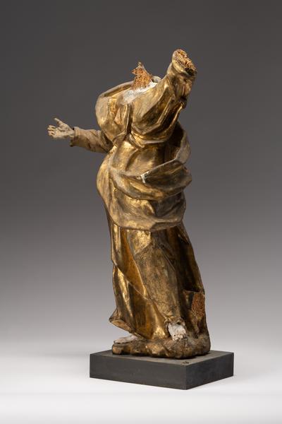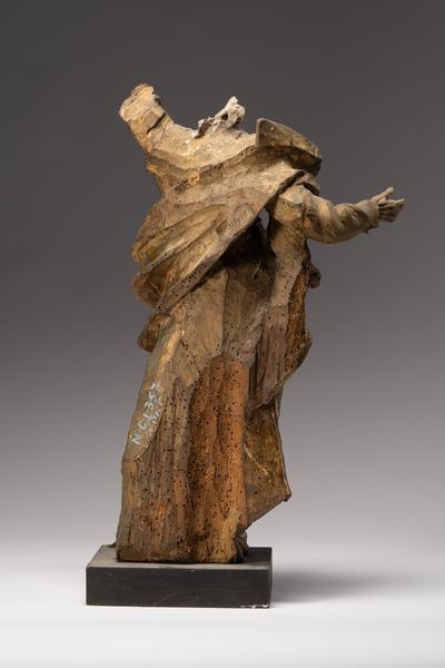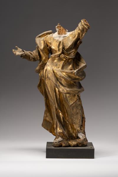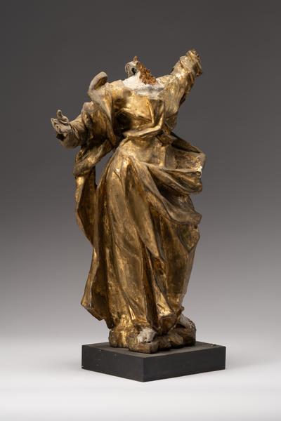 Постать святого без голови (голова втрачена) відтворена у S-подібному силуеті (figura serpentinata), поширеному в бароковому мистецтві. Фігура представлена у динамічній позі з театрально розведеними руками. Тіло прикрите довгою тунікою, що залишає відкритими лише стопи. Драперія, перекинута через праве плече, огортає стегна. Її покривають м’які пластичні згини, пророблені рельєфними горизонтальними пасмами. Вбрання святого вкрите складками, що переходять від плавних вигинів до геометризованих площин, повторюючи обриси фігури.