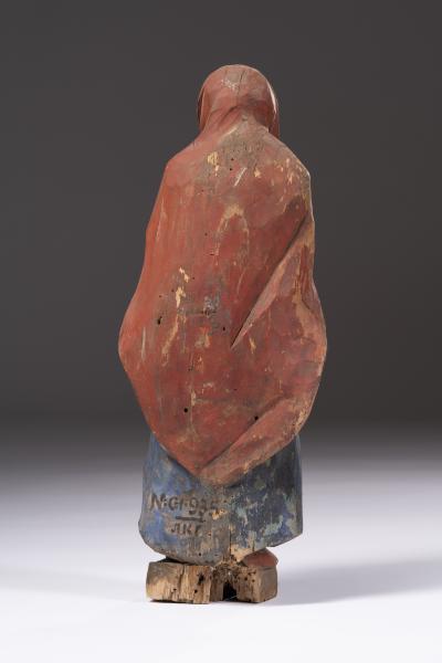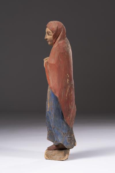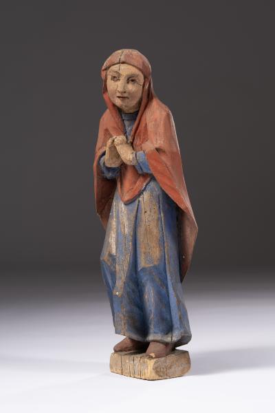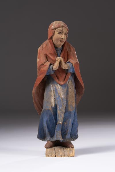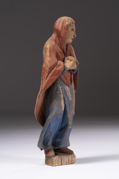 Невеликого розміру фігура Богородиці з с. Дубравка розташована на квадратній підставці. Майже кожен народний майстер починав різьбити скульптуру з верхньої частини, не окреслюючи загальних обрисів, тому часто постаті менш пропорційні, аніж презентована робота. Скульптура повнофігурна, фронтальна. Наслідуючи поставу професійних скульптурних зображень, автор відтворив Богородицю ледь нахиленою ліворуч, її контрапостна фігура з виставленою вперед ногою завмерла в граційній позі. Свята одягнена в довгу синю туніку, голову покриває мафорій червоного кольору. Одяг змодельований чіткими лініями драперій. Лагідне обличчя Марії незворушне – свята, попри біль втрати, перебуває в стані глибокої віри. Богородиця зі складеними руками на грудях уособлює образ покори та смиренності.
