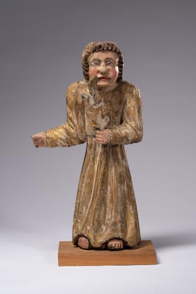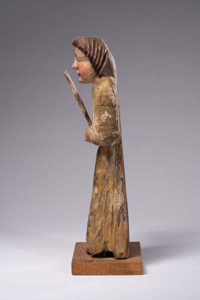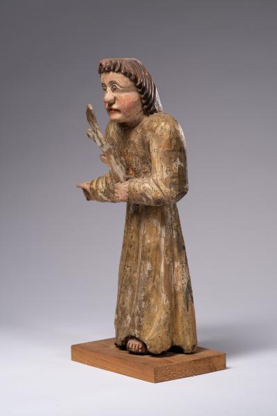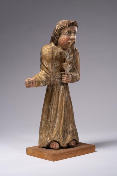 Велику частину творів народної пластики становили скульптурні зображення ангелів. Вони були різних розмірів та мали різні функції: оздоблювали іконостаси, бічні вівтарі, виконували роль свічників. Скульптура ангела з с. Ясениця-Замкова слугувала свічником, судячи з жесту відведеної убік правої руки та зігнутих пальців, що утворюють місце для свічки. Статична, дещо присадкувата постать одягнена у довгу туніку, на якій народний майстер різцем позначив прямі ряди вертикальних ліній, що імітують складки. У примітивній манері відтворено обличчя ангела: невисоке чоло з рівними дугами брів, клиноподібний ніс, підведені яскраво-червоною фарбою широкі вуста та опуклі рожеві щоки. Прямокутне обличчя фігури обрамлене темним хвилястим волоссям. У лівій руці затиснена пальмова гілка.