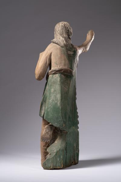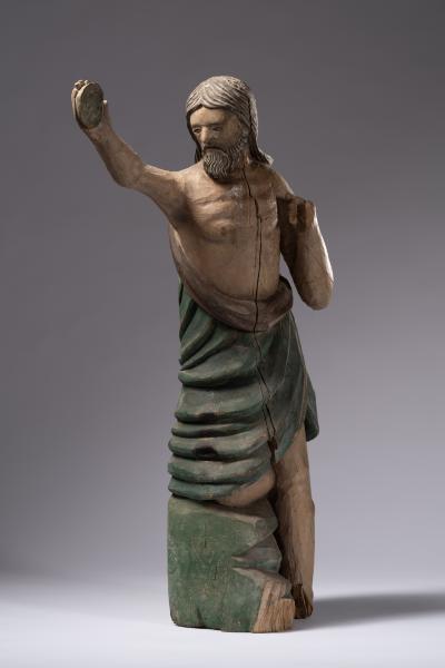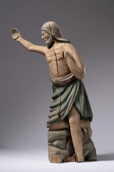 Іван Хреститель – пророк, син священника Захарія та праведної Єлизавети, попередник Христа. Він був вибраний, щоб підготувати людей до визнання Спасителя Месією. У православній традиції святий відігравав помітнішу роль, ніж у католицькій. Православ’я шанує Івана також як аскета, пустельника, ідеального ченця, який є представником «ангельського чину». Повнофігурна постать Івана Хрестителя коліном правої ноги спирається на камінь. Права рука святого піднята вгору, він тримає посудину для хрещення. Стегна Хрестителя огортає драперія, складки якої плавними овальними лініями паралельно розташовані по всій поверхні, не повторюючи анатомію руху святого. Автор майстерно відтворив побудову тіла людини – очевидно, йому були знайомі роботи професійних скульпторів. Він у притаманній для народних митців манері передав фігуру Івана не зашліфувавши поверхню тіла, де видніються розташовані один біля одного грубі сліди від різця. Основна увага в роботі зосереджена на обличчі Хрестителя, який, напівприкривши повіки, спрямував свій погляд вниз. Фігура святого, його поза й піднята рука, що тримає невеличку посудину говорять про те, що скульптура була частиною іконографічної композиції хрещення Ісуса Христа.