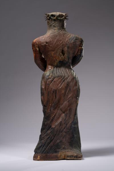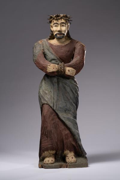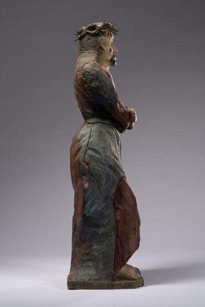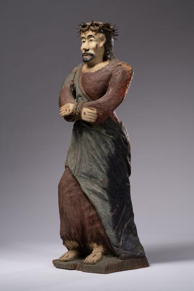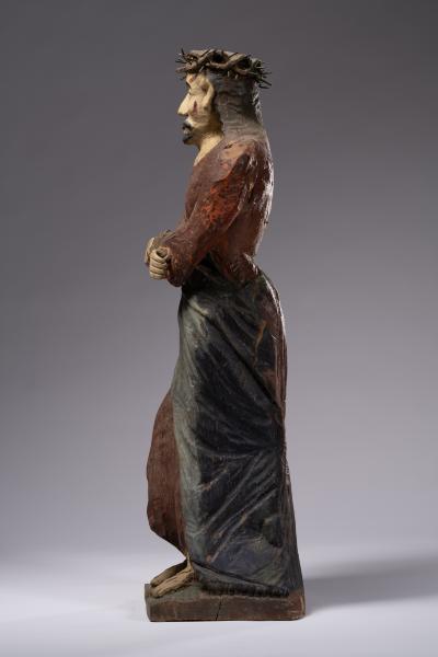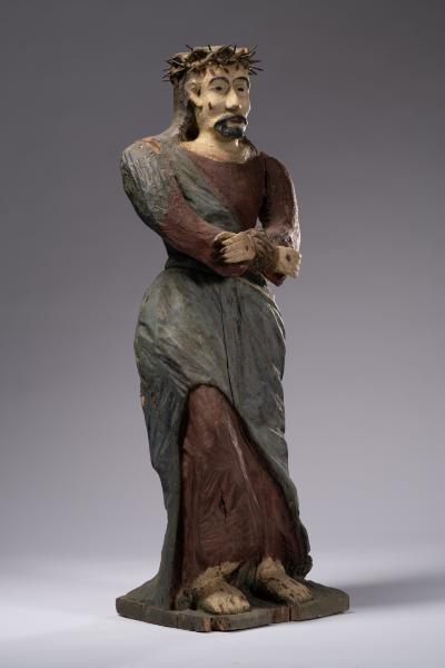 Численність скульптурних фігур Христа у церквах західної частини України була пов’язана з впливом західноєвропейської іконографії на місцеві традиції. Образи Спасителя у дерев’яній пластиці були різноманітними. Зображували Пантократора, Вознесіння, Богоявлення, Розп’яття, часто використовували сюжети зі Страсного циклу. Народний майстер у примітивній манері відтворив Христа, використавши образ зі Страстей, що передають останні епізоди його земного життя. Спаситель стоїть босий перед Понтієм Пилатом з пов’язаними хрест-навхрест руками – алюзія на хрест Розп’яття. Статична скульптура вирізьблена з цільного шматка дерева, лише окремі елементи дороблені. Застосувавши всі свої вміння у відтворенні людського тіла, народний майстер вирізьбив фігуру Христа, приховавши більшу частину тіла під довгим, вишневого кольору хітоном та перекинутим через праве плече омофором. На голові Ісуса терновий вінок, голки якого впиваються в тіло та утворюють рани, з яких густими краплями тече кров. Видовжене овальне обличчя святого з випнутим клиноподібним носом спокійне та незворушне. В його виразі відчувається готовність прийняти мученицьку смерть. На обличчі немає гніву, спротиву, ненависті.