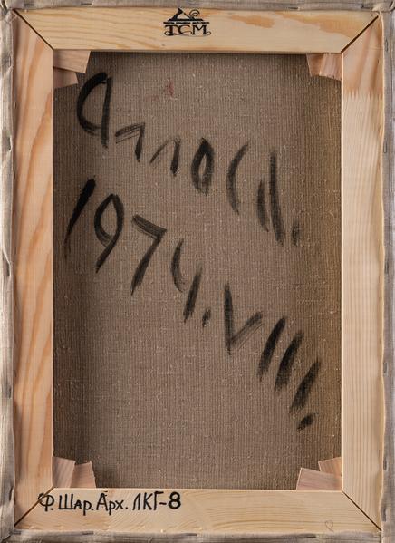 На майже ахроматичному тлі білою та чорною фарбами зображено серію смуг, що нагадують каліграфію івриту. Структура образів свідчить про своєрідне нанесення цих мотивів: так, як це практикували переписувачі текстів – з відривом лише в окремі, чітко означені моменти. З огляду на стилістичні особливості зображення, частину інтерпретацій коректно співвіднести з роботою «Судороги» (Ф.Шар.Арх.ЛКГ-3).