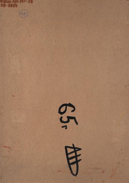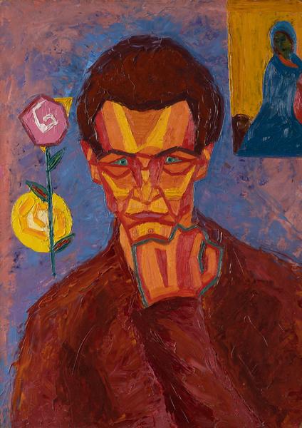 На вертикальному форматі живописними засобами зображено чоловічий погрудний портрет на умовному тлі. Складний фіолетовий, що переходить у синій, є немов своєрідним сяянням від постаті. Сама фігура молодого чоловіка з густою короткою зачіскою намальована у фас, голова оперта на зігнуту кисть лівої руки. На портретованому червоно-бурий светр, імовірно грубої в’язки. Привертає увагу геометрична стилізація обличчя, розподіленого на окремі фігури, які підкреслюють природну структуру голови та кисті людини (складніша й більш декоративна, аніж обрубовка по Гудону). Такий підхід є виразним результатом ознайомлення з практиками модерністичного, зокрема авангардного порядку (наприклад, Олександра Богомазова) та є унікальним для локального осередку, де на той момент працював художник. З правого боку від портретованого зображено стилізовану квітку, ймовірно троянду. У верхньому правому куті відтворено паперову репродукцію відомої роботи Сімоне Мартіні «Мадонна зі сцени "Благовіщення"» (1340–1344, Державний Ермітаж, Санкт-Петербург, Російська Федерація).