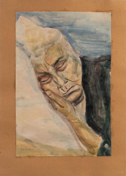На тлі світлої, злегка блакитної стіни, виконаної напівпрозорими акварельними мазками пензля, зображено верхню частину торса літньої жінки (волосяний покрив голови цілком сивий, виразні вікові мімічні зморшки та інші зміни шкіри обличчя вказують на те, що зображеній понад 70 років). Жінка одягнена у халат зеленкаво-коричневого кольору. Волосся коротке, є ознаки модельної стрижки, кисті та пальці доглянуті. Постать лежить на правому боці, під обличчя підкладена ліва рука. З огляду на специфіку стану шкірних покривів, вірогідно, у зображеної була серцева недостатність. Голова портретованої оперта на пір’яну подушку у звичайній для того часу білій накрохмаленій наволочці без додаткового декору. Оскільки жінка спить на ліжку вкритому світлим жовтим покривалом, зарисовка найімовірніше була здійснена під час денного сну. Гама холодна, гармонійна, є тональні акценти. Загалом побутовість ситуації й реалістичний характер зображення дають змогу стверджувати, що робота є навчальною замальовкою з натури, а відтак існує вірогідність, що портретована – Фаня Яківна Шаргородська (12.01.1988 – 05.12.1969). Адже простір, у якому зроблено етюд – домашній, постановка ситуативна, а модель не відчувала дискомфорту від присутності сторонньої особи.