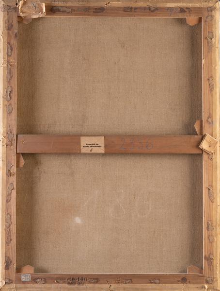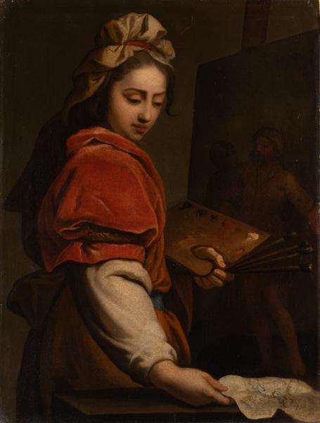 На полотні зображена молода жінка, яка стоїть перед мольбертом з картиною. Жінка розглядає ескіз на папері, який тримає правою рукою над столом. Її корпус повернений вправо. В лівій руці вона тримає палітру і чотири пензлі. Одягнена жінка в червону велюрову сукню з короткими широкими рукавами, з-під яких видно білий рукав сорочки. На голові хустка з червоною стрічкою. На мольберті зображення двох чоловічих постатей. Картина невідомого автора надійшла зі збірки Любомирських, її атрибутують Німецькій школі живопису XVIII ст.