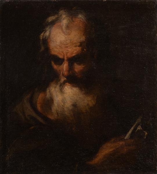 На картині на темному фоні зображений старець із сивою бородою, повернений у три чверті вліво з легким нахилом голови вниз. Обличчя чоловіка з виразом глибокої задуми, сильно затінене навколо очей і рота. З-під накидки видно праву руку, в якій він тримає згорток пергаменту. Картина надійшла до збірки Галереї з колекції професора Пінінського як робота невідомого художника XVIII ст.