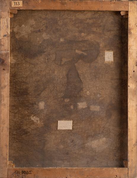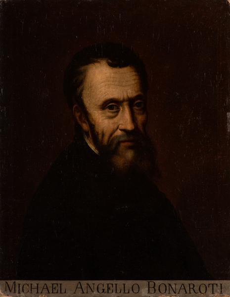 Погрудне зображення чоловіка, повернутого вправо, з поглядом зверненим на глядача. На темно-коричневому тлі виразно зображене обличчя генія доби Ренесансу Мікеланджело Буонарроті (1475–1564) – італійського скульптора, художника, архітектора, поета й інженера. На полотні чітко без ідеалізації відображені характерні особливості зовнішності портретованого – високе зморшкувате чоло з сильно вираженими надбрівними дугами, світло-карі очі, широкий прямий ніс з горбинкою, глибокі складки від ніздрів до кутиків рота. Тонко окреслені вуста, обрамлені вусами, роздвоєна негуста борода та чорне, злегка кучеряве волосся. Існує декілька портретів Мікеланджело. Серед них роботи таких авторів: Себастьяно дель Пьйомбо, Джуліано Буджардіні, Якопіно дель Конте, Марчелло Венусті, Франциско д’Оланда, Джуліо Бонасоне та інші. Мікеланджело не залишив по собі жодного задокументованого автопортрета, однак низку його робіт дослідники вважають можливими зображеннями митця. Серед них – «Святий Прокл Болонський», голова Олоферна у фресці «Юдиф та Олоферн» на стелі Сикстинської капели, переможений у групі «Геній перемоги», обличчя на знятій шкірі Святого Варфоломея (фреска «Страшний суд»).