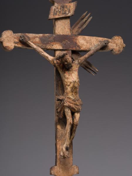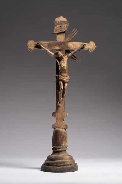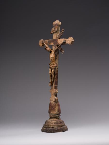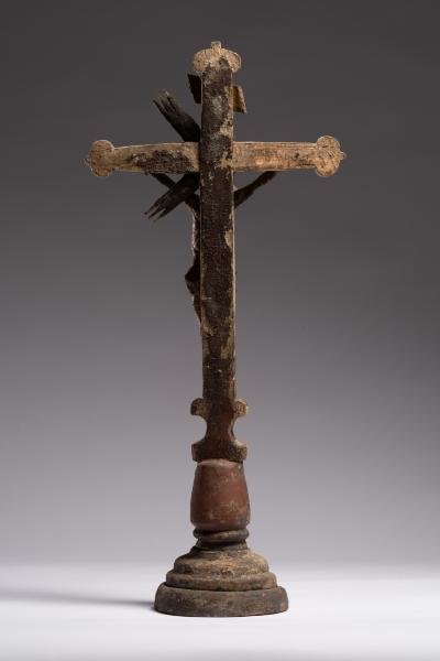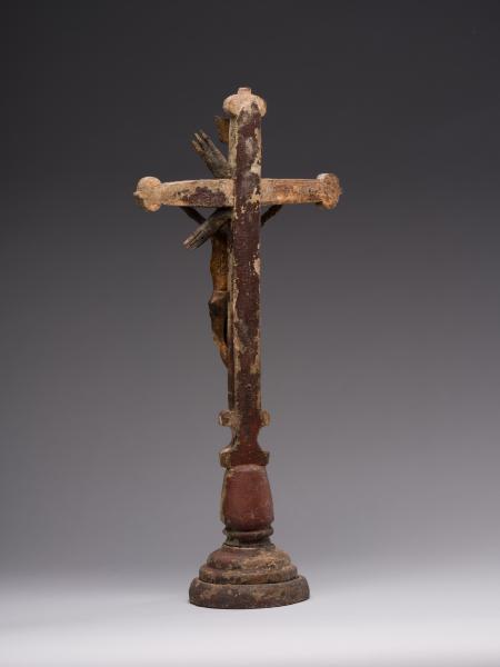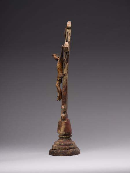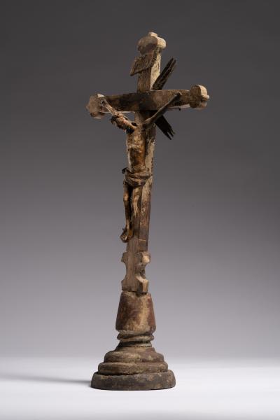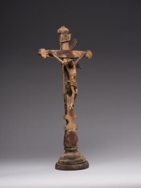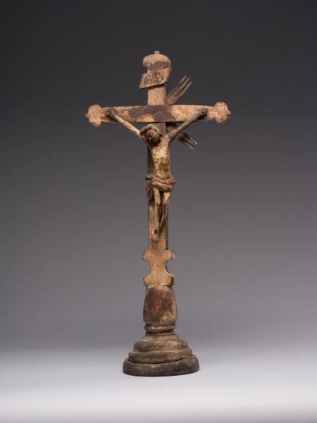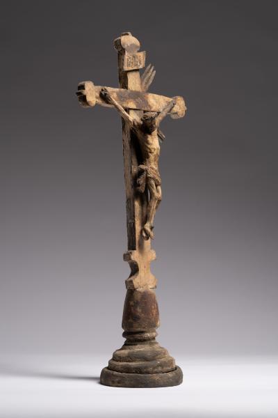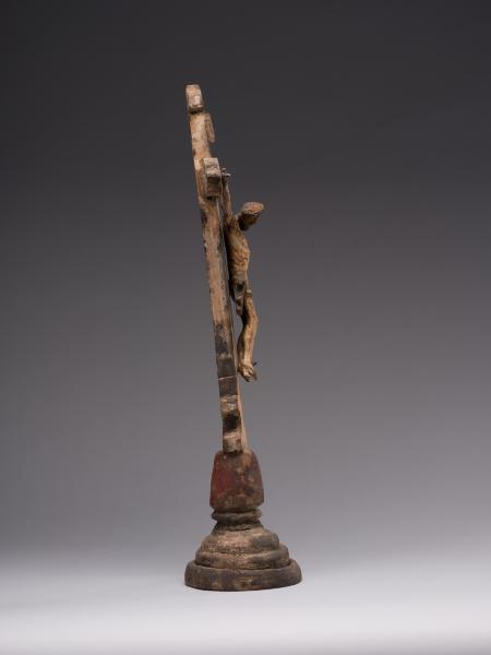 Робота народного майстра презентує різьблене дерев’яне напрестольне Розп’яття. Хрест встановлений на округлій підставці, його кінці мають напівкруглі листочки, що нагадують листя конюшини. Цей символ поширений у релігійних традиціях, вважається уособленням Святої Трійці. Такий тип хреста часто використовували у творчості народні майстри. Верхівку вінчає табличка з написом, що символізує титул Христа «ІНЦІ» (Ісус Назарянин Цар Іудейський). Скульптура Ісуса має виразну архаїчність – видовжене тіло з вираженою худобою, руки підняті та розведені, що надає композиції драматичного наповнення. У роботі відчутна спроба народного майстра до анатомічної схожості у відтворенні людського тіла: рельєфно намічені ребра, запала черевна порожнина, м’язи. Голова Спасителя нахилена праворуч, увінчана терновим вінком, обличчя пророблено схематично без деталізації. Постать прибита до хреста наслідуючи західну іконографічну традицію. Робота має значні сліди часу: деревина потемніла, є втрати, пошкодження, проте це надає їй особливої автентичної сили. У різьбленні відчувається простота та щирість народного майстра. Витвір сакральної пластики поєднує суворість форм, духовну експресію та глибокий символізм страждання і надії.