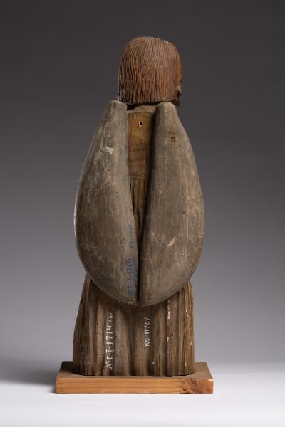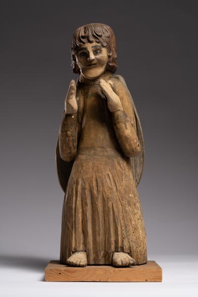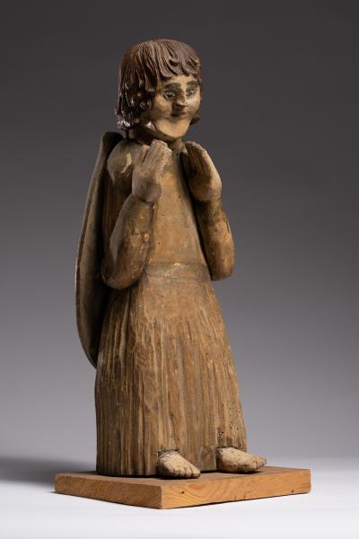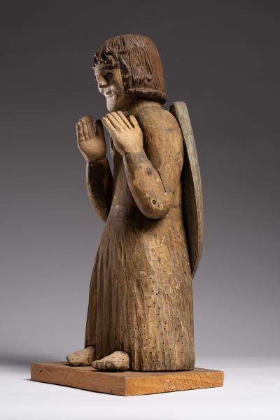 Народні майстри за браком чітко виробленої іконографічної схеми образу ангела різьбили фігурки з крилами та без, наділяли ангелів рисами малих дітей, молодих юнаків та дівчат. Невелика присадкувата повнофігурна постать ангела з с. Хоробрів відтворена у вигляді молодого юнака. Вона є парною до скульптури С-І-1713. Беземоційною та статичною є фронтальна фігура з молитовно піднятими руками, світлим обличчям та непорушним поглядом з маленьких близько посаджених очей. Видовжений овал обличчя огортають завитки волосся, проробленого схематично неглибокими ритованими лініями. Тіло ангела прикриває довга туніка, підперезана поясом, що залишає відкритими лише ступні. Одяг змодельований графічно проробленими неглибокими вертикальними лініями, які ритмічно покривають усю поверхню. Збережена поліхромія доповнює пластичне сприйняття скульптури, підкресливши її наївний образ.