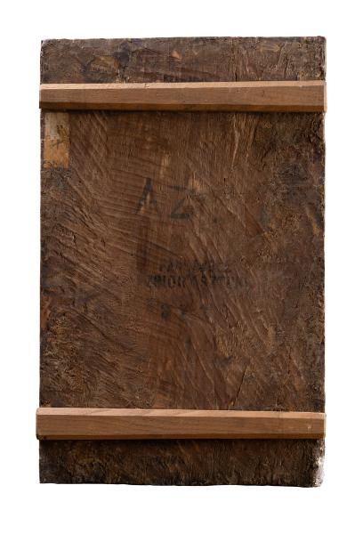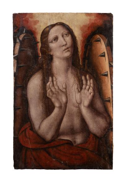 Полотно «Свята Катерина» є копією картини Джованні П’єтро Ріццолі, відомого як Джампетріно (бл. 1495–1549, Мілан). Джампетріно був одним із головних ломбардських послідовників Леонардо да Вінчі. Іконографія роботи типова – свята Катерина з рудуватим волоссям відтворена в акті молитви, її тіло частково вкрите червоно-пурпуровим плащем на стегнах. Обабіч святої зображено колеса з гострими металевими виступами – знаряддям її тортур. Фон характеризується червоними спалахами фарб, елементами світлих і темних хмар, які драматично окреслюють сцену мучеництва і водночас виділяють для глядача освітлену постать святої. З огляду на формальні та іконографічні характеристики, композиція властива манері живописця – це простежується у різних численних версіях картини.